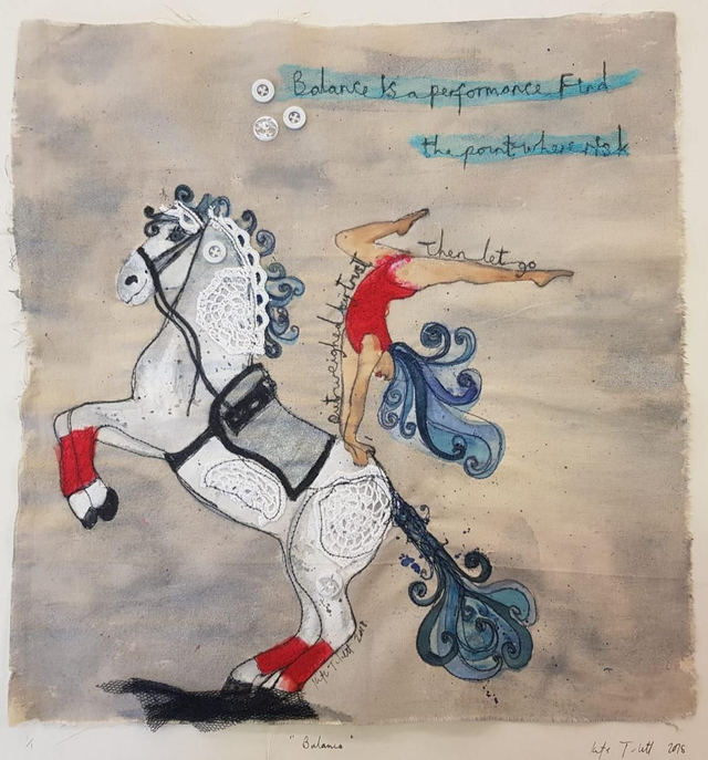 A striking mixed media artwork exploring themes of balance and letting go. Features a elegant white circus horse adorned with decorative lace appliqué and buttons, paired with an acrobatic figure in graceful backbend position. The piece combines acrylic painting, hand-stitched embroidery, and collage elements on natural canvas. Inspirational text woven throughout reads "Balance is a performance. Find the point where risk...then let go." The colour palette of navy blue, crimson red, and soft neutrals creates a contemplative, artistic atmosphere. Perfect for yoga studios, creative spaces, or anyone drawn to meaningful, thought-provoking art.
