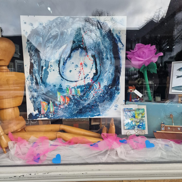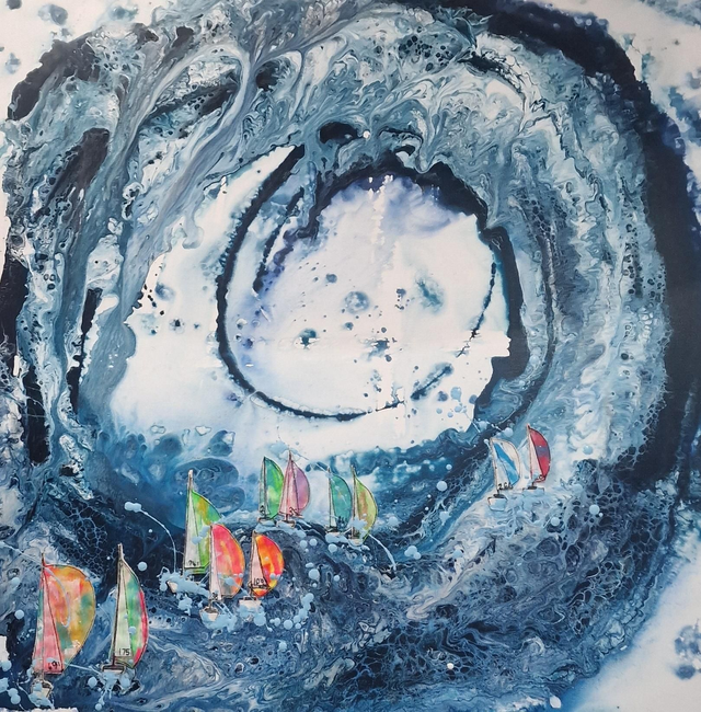Acrylic pour with freehand machine, hand embroidered, and acrylic painted boats.
